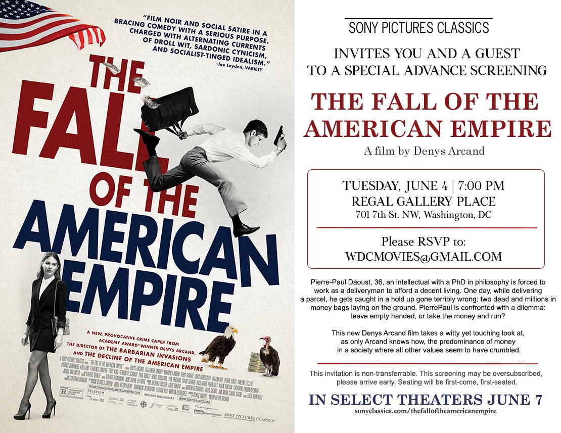Embassy Of Canada Us On Twitter Attention Film Buffs 50 Tix Are Available For An Advance Screening Of The Fall Of The American Empire The New Film By Canadian Director Denysarcand